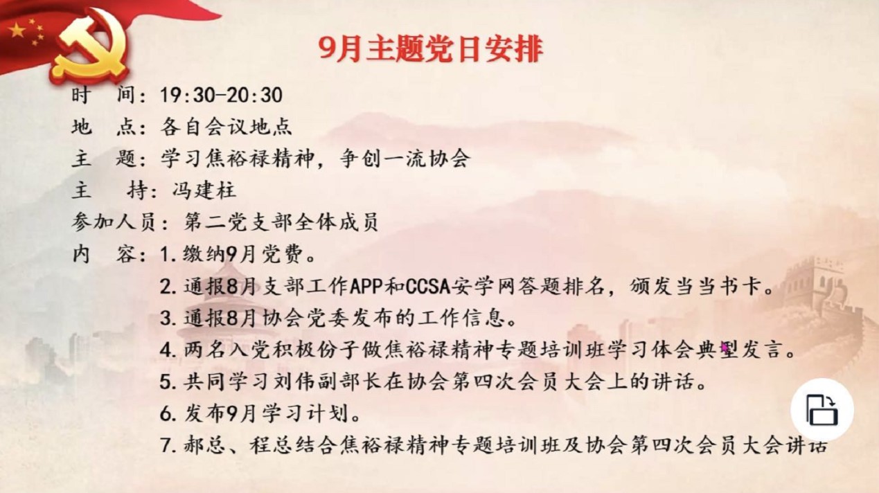 主題黨日活動主要通報了8月支部工作APP和微信答題排名,頒發了優秀黨小組流動紅旗,重點學習了應急管理部副部長劉偉在協會第四次會員大會上的講話。