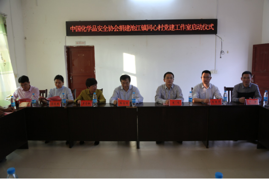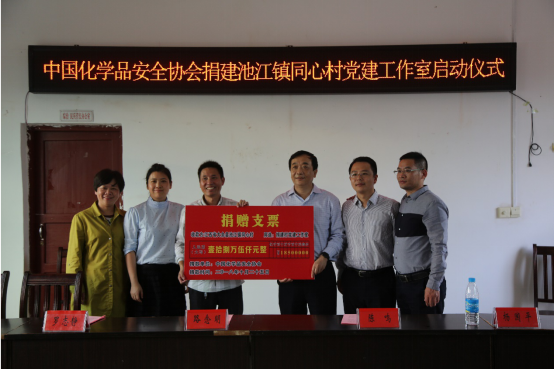 2018年10月25日,中國化學品安全協會黨支部書記路念明、組織委員馬欣妮,以及大余縣縣委常委、副縣長陳鳴,池江鎮黨委書記羅志靜一行來到了同心村,與村兩委班子成員開展工作座談并舉行捐建同心村黨建工作室啟動儀式,向同心村捐獻黨建工作室建設資金18.5萬元。
