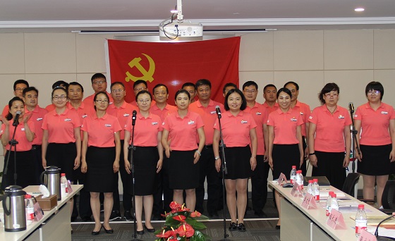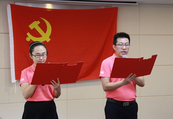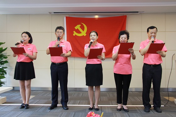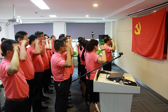 主題黨日活動現場簡樸莊重、氣氛熱烈濃厚,一面鮮艷的黨旗懸掛正中。下午3時許活動開始,參加活動的共產黨員身著紅色T恤,胸前佩戴黨徽,在支部書記路念明同志帶領下,大家舉起右手,面對黨旗,集體重溫入黨誓詞,在回顧往昔中感懷黨恩,在重溫誓詞中銘記宗旨,表達不忘初心、繼續前進的堅定信念。
