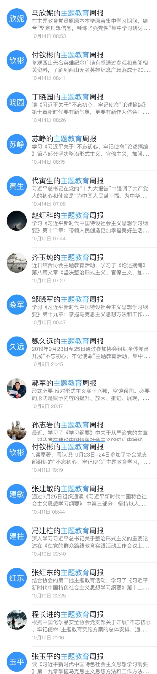 隨著中國(guó)化學(xué)品安全協(xié)會(huì)“不忘初心、牢記使命”主題教育的不斷推進(jìn),協(xié)會(huì)黨員紛紛在“釘釘”辦公系統(tǒng)上提交了主題教育周報(bào)。截至目前,全體黨員都分別提交了至少兩期主題教育周報(bào),內(nèi)容也日漸豐富。