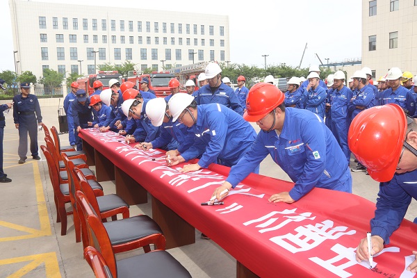 精益化工部分領導、員工代表、承包商單位項目負責人等200余人在副總經理鄭紅智的帶領下進行了莊嚴的安全宣誓。安健環部經理宣讀了《關于開展2024年“安全生產月”活動的通知》,對“安全生產月”各項工作進行安排部署。全體人員在“人人講安全、個個會應急——暢通生命通道”的主題橫幅上簽名,表達對安全宣誓詞的鄭重承諾。