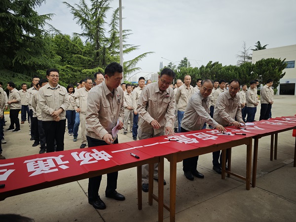 機械修造部、計控電儀部、合成車間負責人作“安全生產(chǎn)月”承諾發(fā)言。全體員工在安全生產(chǎn)主題橫幅上簽名。