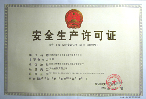 大唐內蒙古多倫煤化工有限責任公司按照《危險化學品生產企業安全生產許可證實施辦法》要求,在取得安全設施竣工驗收批復文件之后,加快問題整改和積極籌備,在規定時間內,及時向內蒙古自治區安全生產監督管理局提交了辦理安全生產許可證的申請。經過努力專人現場辦公、及時反饋和整改審查過程中不合格項,加快了安全生產許可證的取證進度。2012年12月3日,順利通過了內蒙古自治區安全生產監督管理局安全許可申報資料審查,成功取得了安全生產許可證(正、副本)。