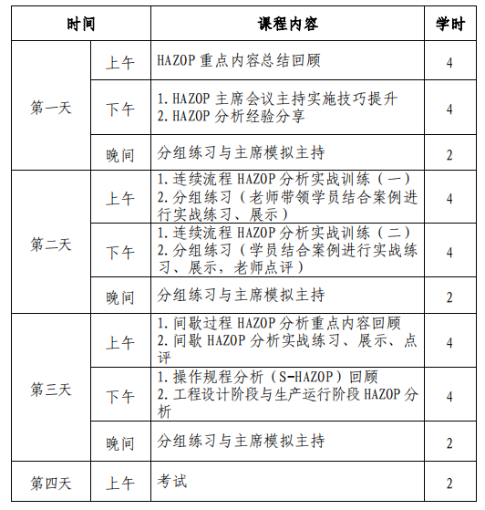 實操培訓包括:HAZOP主席會議主持技巧及經驗分享、連續流程HAZOP分析實戰訓練、間歇過程HAZOP分析實戰訓練、分組練習與HAZOP主席模擬主持等。