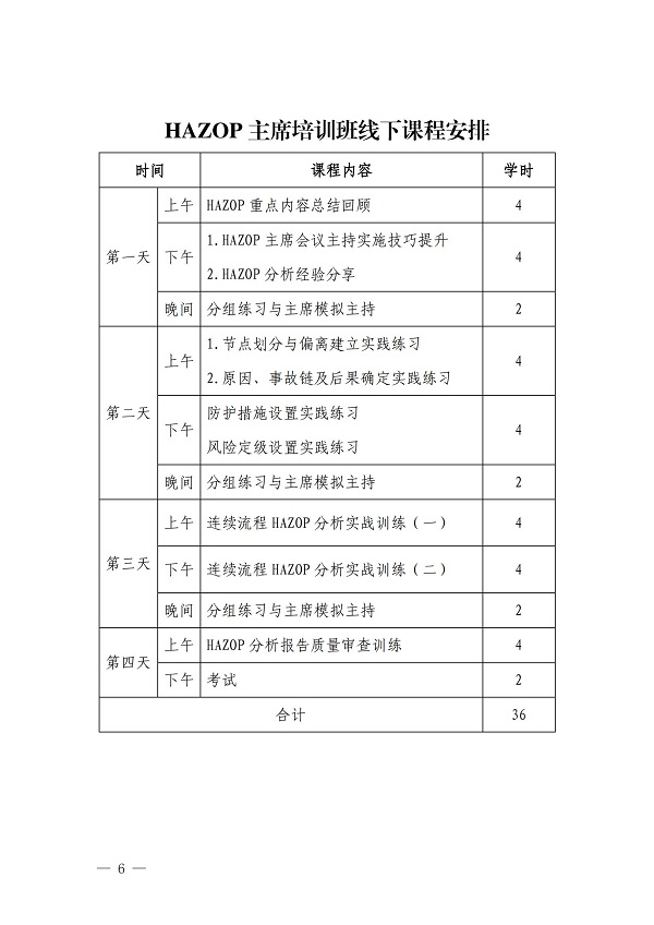 理論培訓包括:HAZOP 重點理論知識回顧、獨立保護層的判別及消減、HAZOP 與 LOPA 分析方法的結合應用、工程設計階段與生產運行階段 HAZOP 分析、間歇過程和操作規程的HAZOP 分析、《危險與可操作性分析(HAZOP 分析)質量控制與審查導則》解讀等。