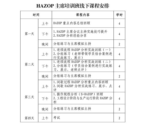 實操培訓包括:HAZOP主席會議主持技巧及經驗分享、連續流程HAZOP分析實戰訓練、間歇過程HAZOP分析實戰訓練、分組練習與HAZOP主席模擬主持等。