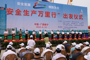 6月18日,由中宣部、安全監管總局、公安部、廣電總局、全國總工會、團中央、全國婦聯、廣西壯族自治區、黑龍江省人民政府共同舉辦的2010年“安全生產萬里行”活動啟動儀式在廣西南寧舉行。全國“安全生產萬里行”組委會主任、國家安全監管總局局長駱琳,廣西壯族自治區主席馬飚出席啟動儀式。人民日報、新華社、中央廣播電臺、中央電視臺等近30家中央媒體和地方新聞單位組成的記者采訪團參加此項活動。